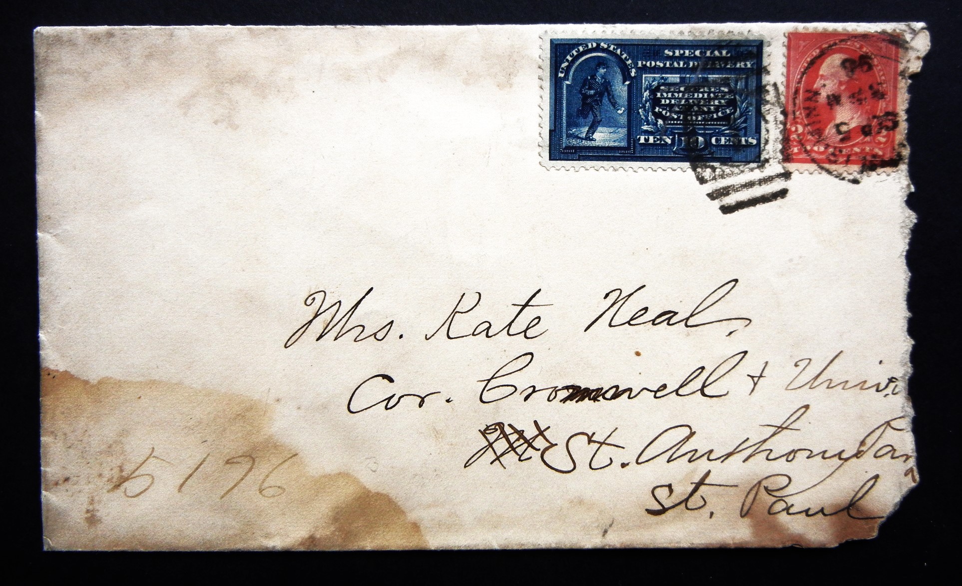 MINNESOTA: ST. PAUL 1898 SPECIAL DELIVERY COVER. SCOTT E5 STAMP. A+ CENTERING Special delivery stamp has large margins and is A+ for centering. Cover has some wear, but still a good item. |