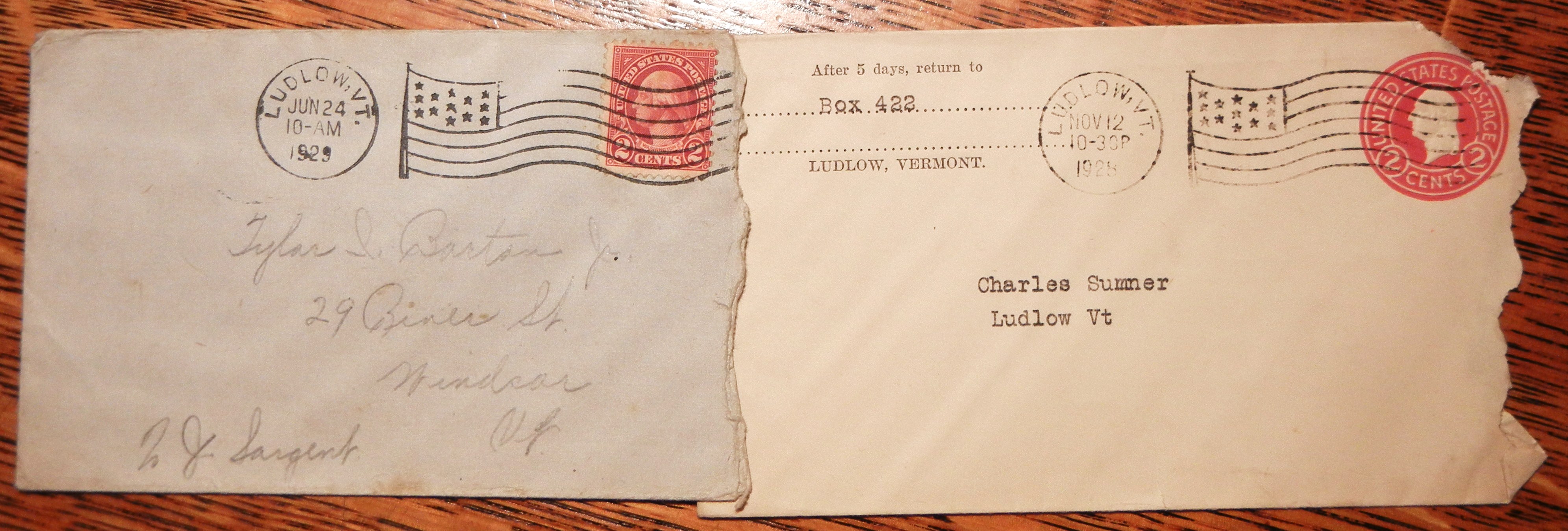 Ludlow Vermont 1920s Two Flag Cancel Covers Both covers feature full flag postmarks. Both are opened roughly at right. This flag cancel has a Langford rating of 30. |