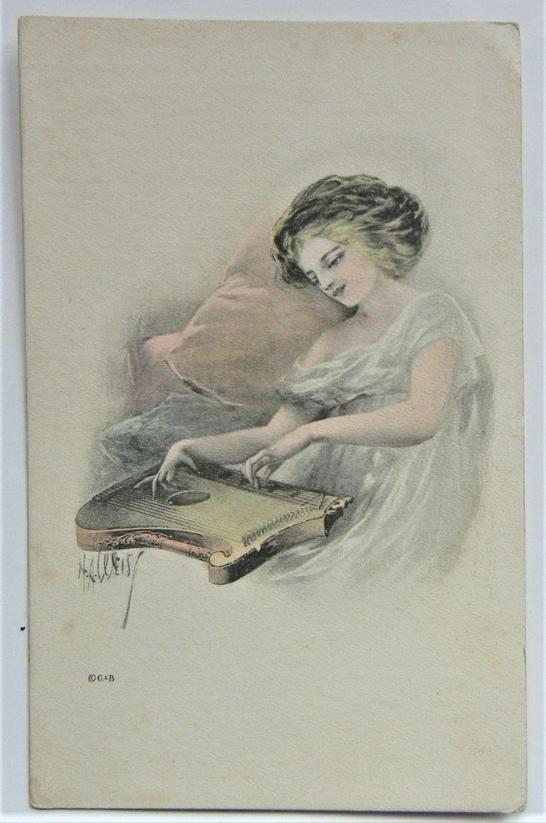 early-artist-drawn-postcard-of-young-woman-playing-the-zither EARLY ARTIST DRAWN POSTCARD OF YOUNG WOMAN PLAYING THE ZITHER