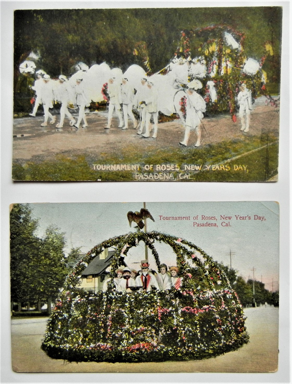 The postcard at top appears to be a very early Rournament of Roses Parade float card in tht the street isn't even paved.  Card was not mailed but has message on back.  The bottom card is postmarked1908.  Both appear to be colorized.