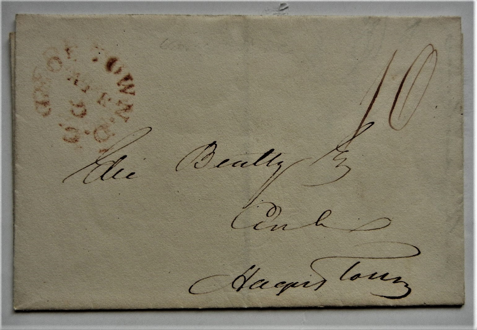 Elie Beatty was president and cashier of the Hagerstown Bank. Beatty was a prominent citizen of Hagerstown, Maryland, having served as assistant postmaster, bank president, and a member of the Hagerstown Academy's board of directors. Postmark is light and appears to be no outer rim.  However, 1830 date precedes no outer rim postmark.  Under magnification, tiny lines from an outer rim are visible.