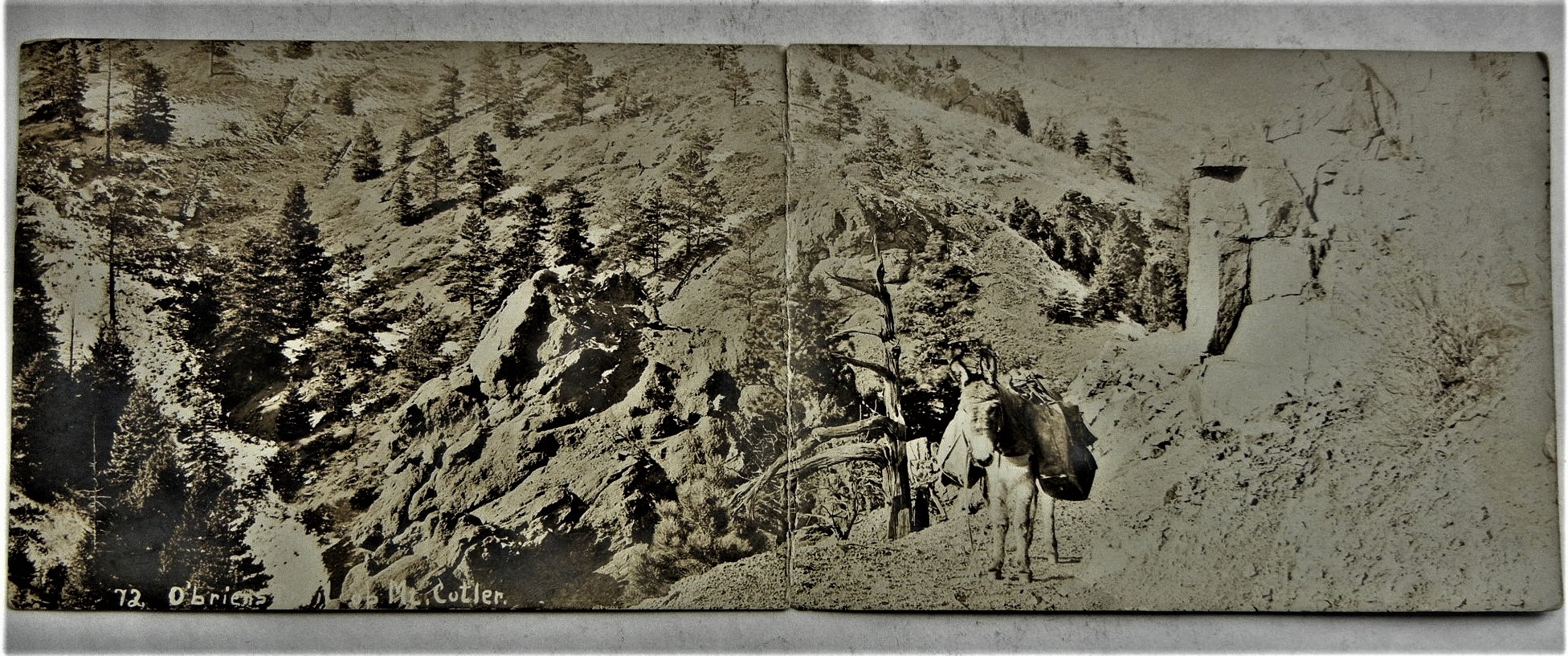 Spectacular fold out postcard showing the rough terrain challenges provided ny O'Brien's Loop Mount Cutler.  Note pack mule lower right center. Do not see a human, so the mule probably belonged to the photographer.  Rare item.