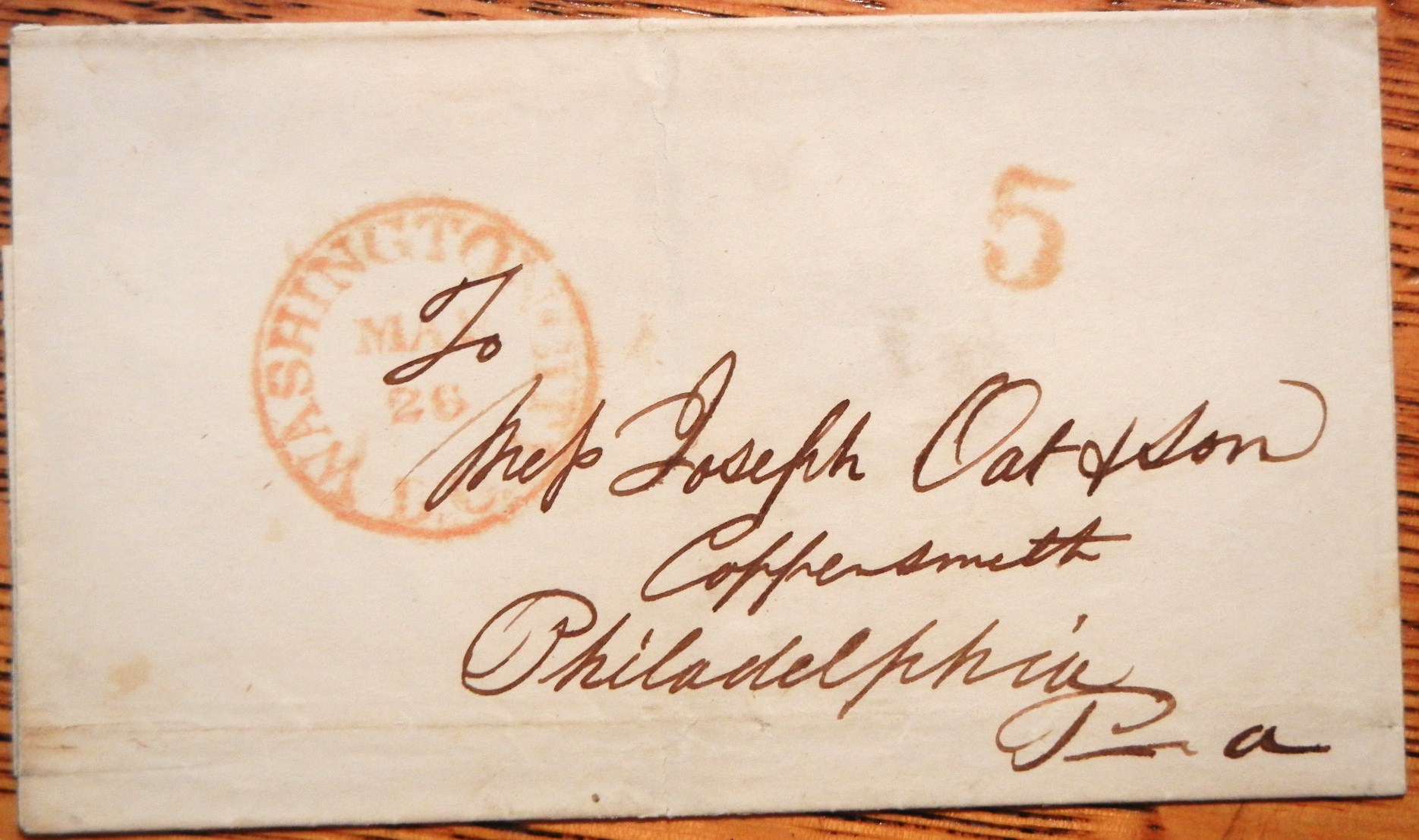 Full postmark and red numeral 5 rate mark on this stampless folded letter from D. B. Clarke to Philadelphia. No content in letter. Joseph Oat Corporation (originally Joseph Oat and Sons) is the oldest continuously operating industrial fabrication business in the United States. Founded in 1788 in historic Philadelphia, Pennsylvania, it was likely patronized by the U.S. founding fathers on their sojourns through narrow cobblestone streets. Started by Jesse Oat, the company sold copper works such as kettles and utensils, competing with other craftsmen including Paul Revere. Jesse’s son Joseph continued in his father’s footsteps adding brass and sheet-iron work to the product offering. Exquisite copper plates and lamps became the company’s forte. They also built stills, steam engine boilers, and pressure vessels for soda water bottlers. Ownership of Joseph Oat and Sons remained in the Oat family until the late 1800’s, when the business was sold to their accountant. In 1966, the business was acquired by its current owners, and the name changed to Joseph Oat Corporation. The business rapidly expanded and moved from its quaint 10,000 sq. ft. Philadelphia location to its current sprawling complex along the Delaware River in Camden, New Jersey. While there is no content in the folded letter, docketing indicates it was from D. B. Clarke, Washington. Clarke was an author and created a tome on the architecture of Washington buildings. Perhaps the original content had something to do with copper finishings Oat and Sons had provided to some of the buildings.